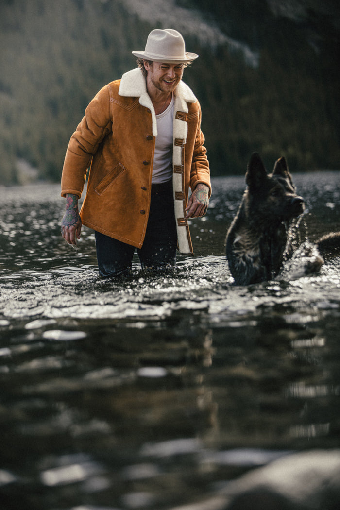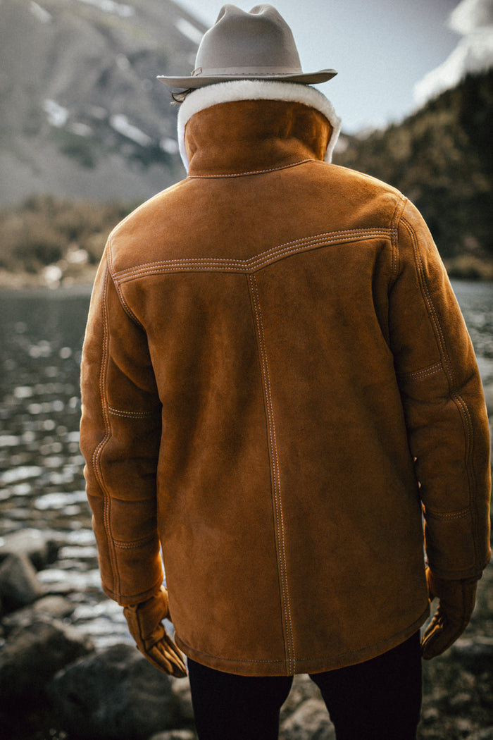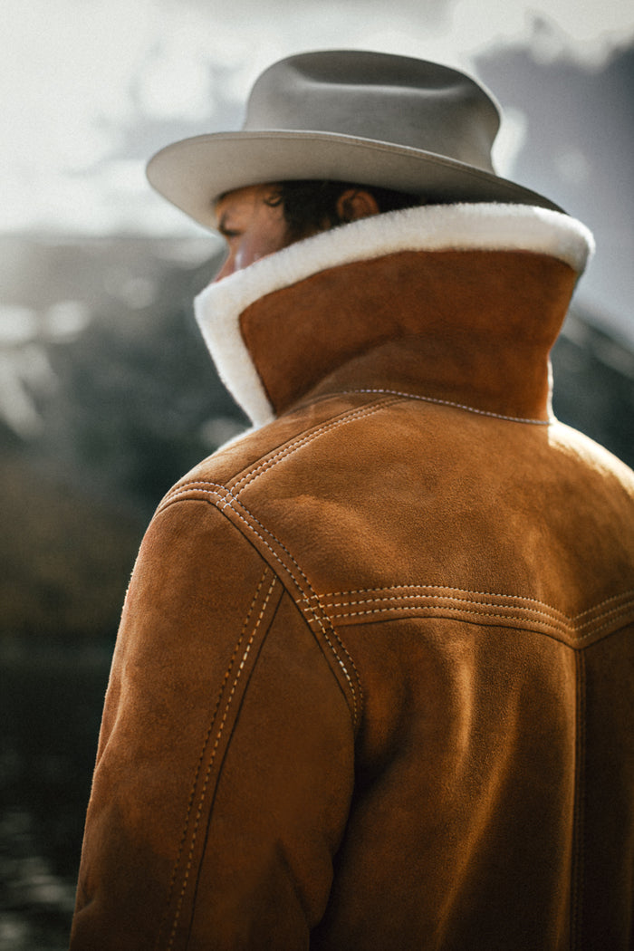 From daring aviators to resilient hunters and ranchers, the sheepskin coat has long been a trusted companion, and our ASPEN jacket proudly continues this legacy. Handmade from exquisite French Merino sheepskin, it ensures not only warmth but a timeless elegance that transcends trends. This jacket is a blend of leather and insulation, featuring leather buttons, heavy stitching details, and iconic lapels that reveal a luxuriously soft 100% French merino sheepskin lining.