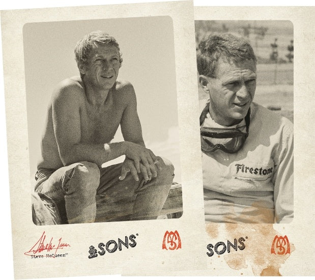 McQueen died 45 years ago but continues to hold sway in modern times as the undisputed “King of Cool,” and over the past decade his handsome, devil-may-care style has influenced companies to create products that allow us to look and feel more like McQueen, from Ford Mustangs and Triumph Scramblers to Barbour jackets and Bell helmets, from Persol sunglasses and Tag Heuer timepieces to this all-new, limited-edition apparel collection from &Sons, created in collaboration with the McQueen estate.
