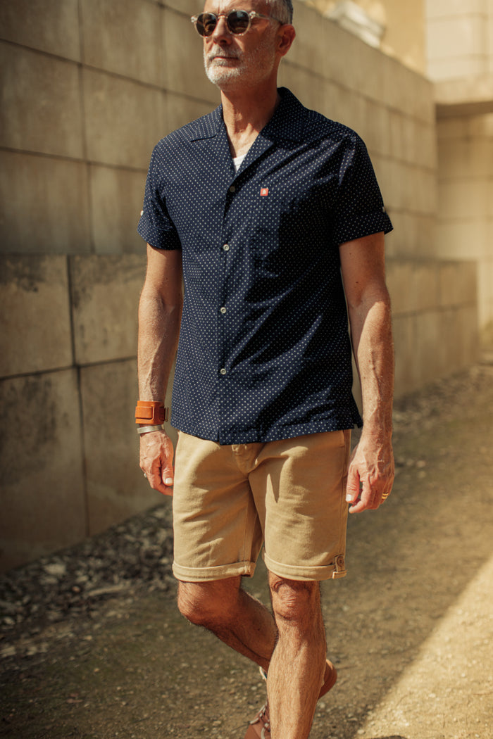 This ensemble exudes timeless elegance with a modern twist, perfect for a variety of occasions from casual outings to evening gatherings. The Mason Club Shirt serves as the focal point, featuring a classic polka dot print and a Cuban collar for a relaxed yet refined look. Crafted from 100% cotton, this shirt offers durability and comfort, ensuring you stay cool and stylish during summer adventures.