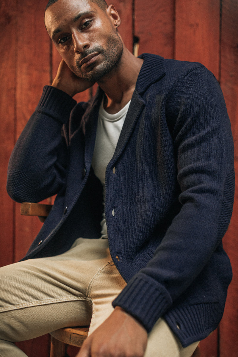 A blazer-style cardigan with the structure to stand tall and the comfort to wind down.